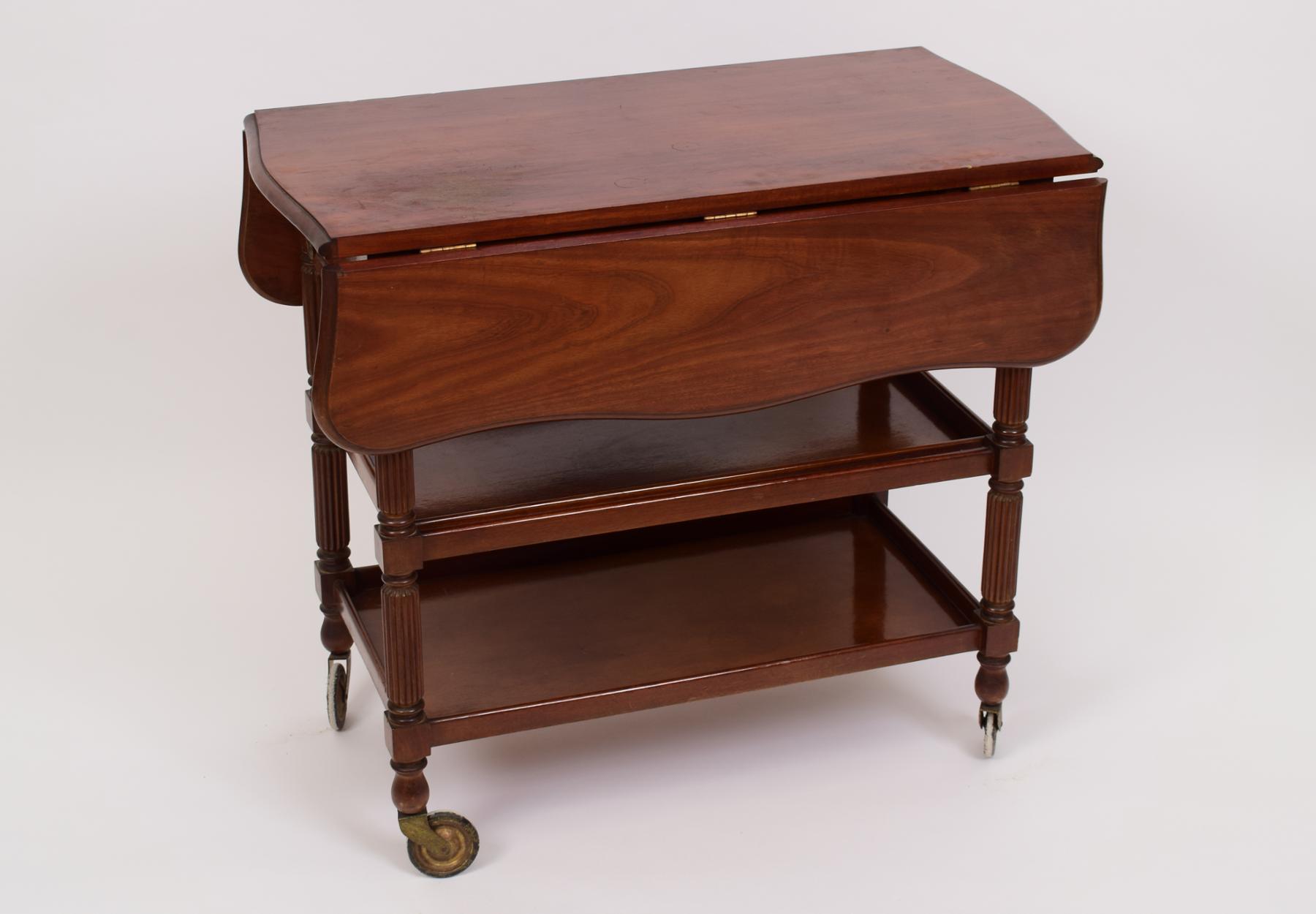 Carrinho de chá mogno e folheado de mogno pernas caneladas, pés com rodízios português séc. XX defeitos no tampo Dimensões (altura x comprimento x largura) - (fechado) 69,5 x 81 x 44,5 cm