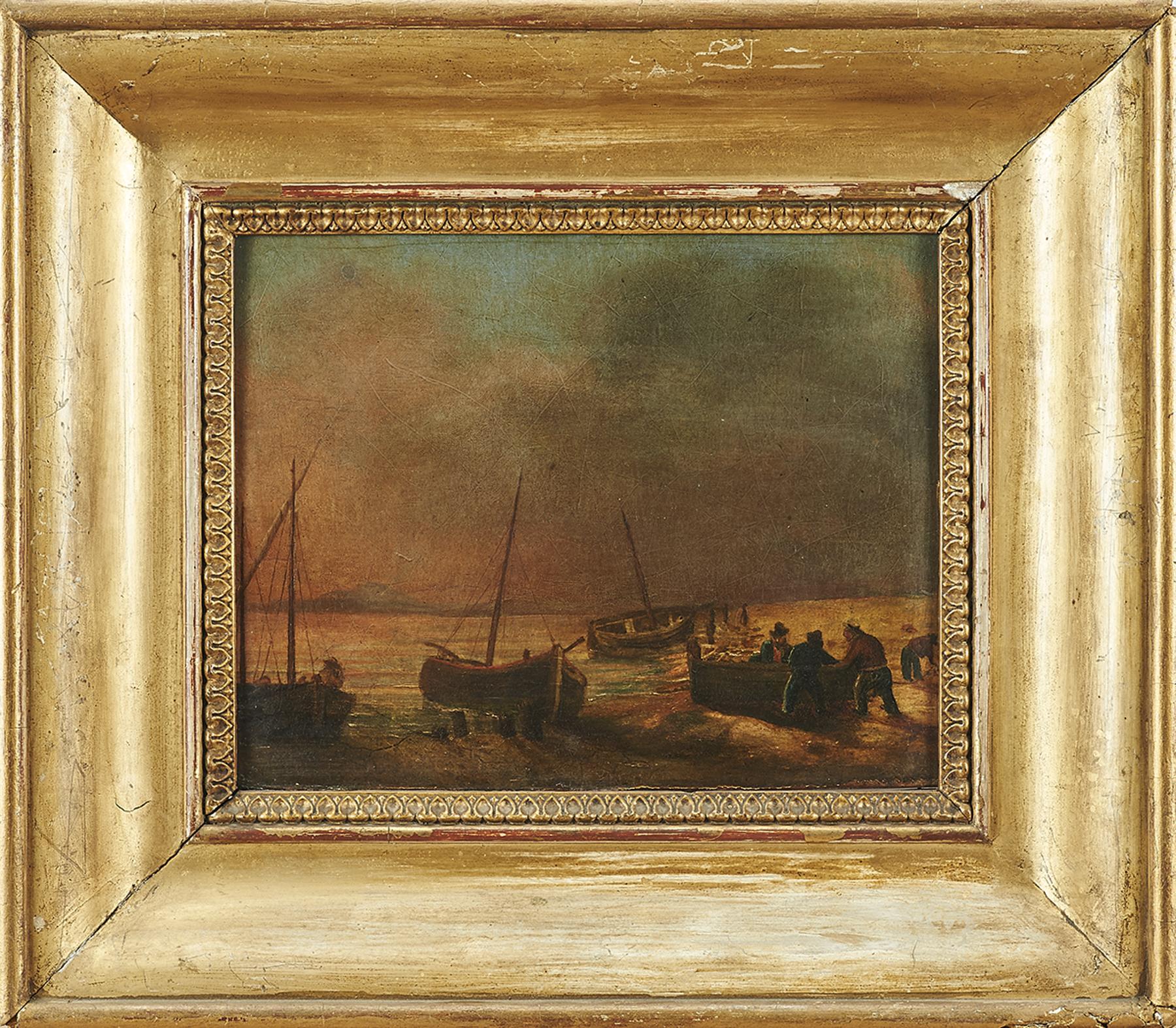 Barcos e figuras na praia óleo sobre madeira escola europeia séc. XIX/XX Dimensões (altura x comprimento x largura) - 20,5 X 26,5 cm