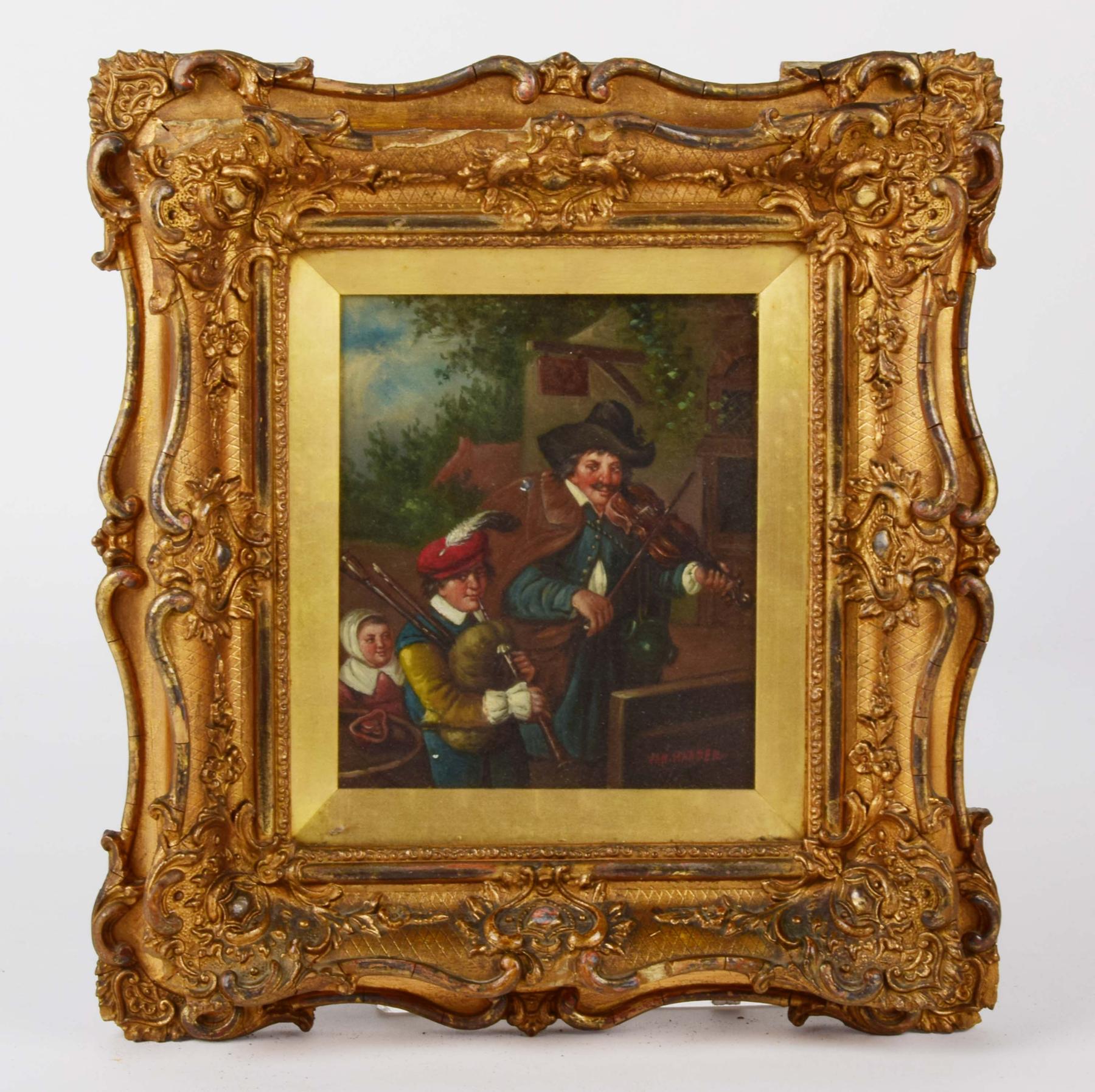 Paisagem rural com músicos óleo sobre folha de flandres holandês séc. XIX falta na pintura, faltas e defeitos na moldura assinado Van Haagen Dimensões (altura x comprimento x largura) - 18,5 x 15,5 cm