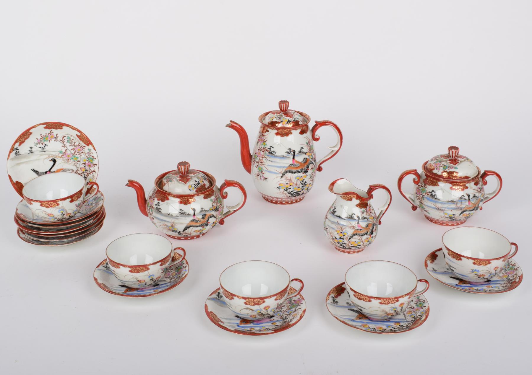 Serviço de chá e de café porcelana japonesa decoração policromada e dourada "Aves e flores", composto por bule, cafeteira, leiteira, açucareiro, cinco chávenas, onze pires séc. XX duas chávenas com cabelos Dimensões (altura x comprimento x largura) - 17 (cafeteira) cm