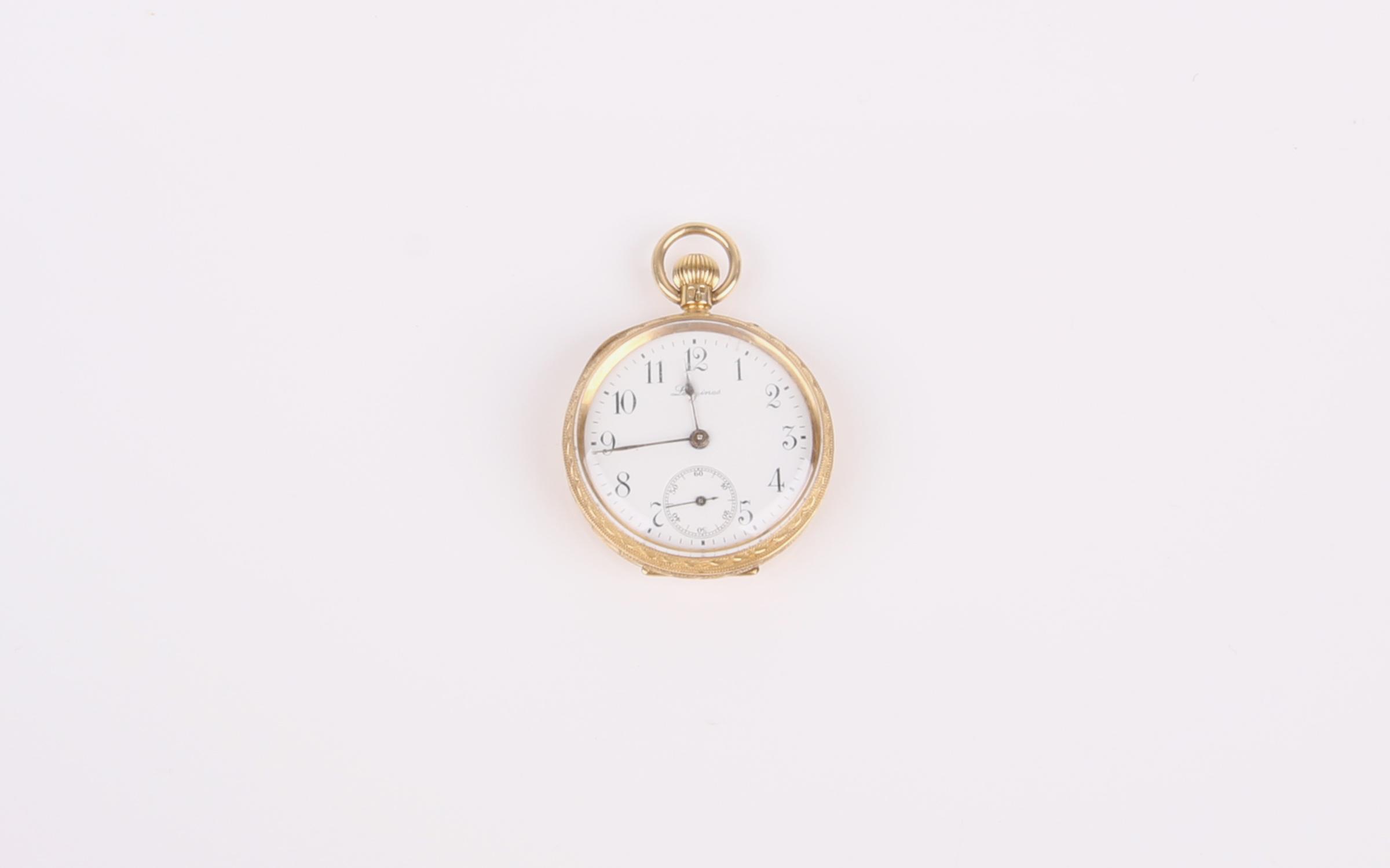 Relógio de lapela LONGINES caixa em ouro de 750/1000 movimento mecânico de corda Suíça séc. XIX/XX defeitos, mecanismo necessita de revisão marca de garantia teor Dimensões (altura x comprimento x largura) - 3,3 cm; Peso - bruto - 30,1 g.