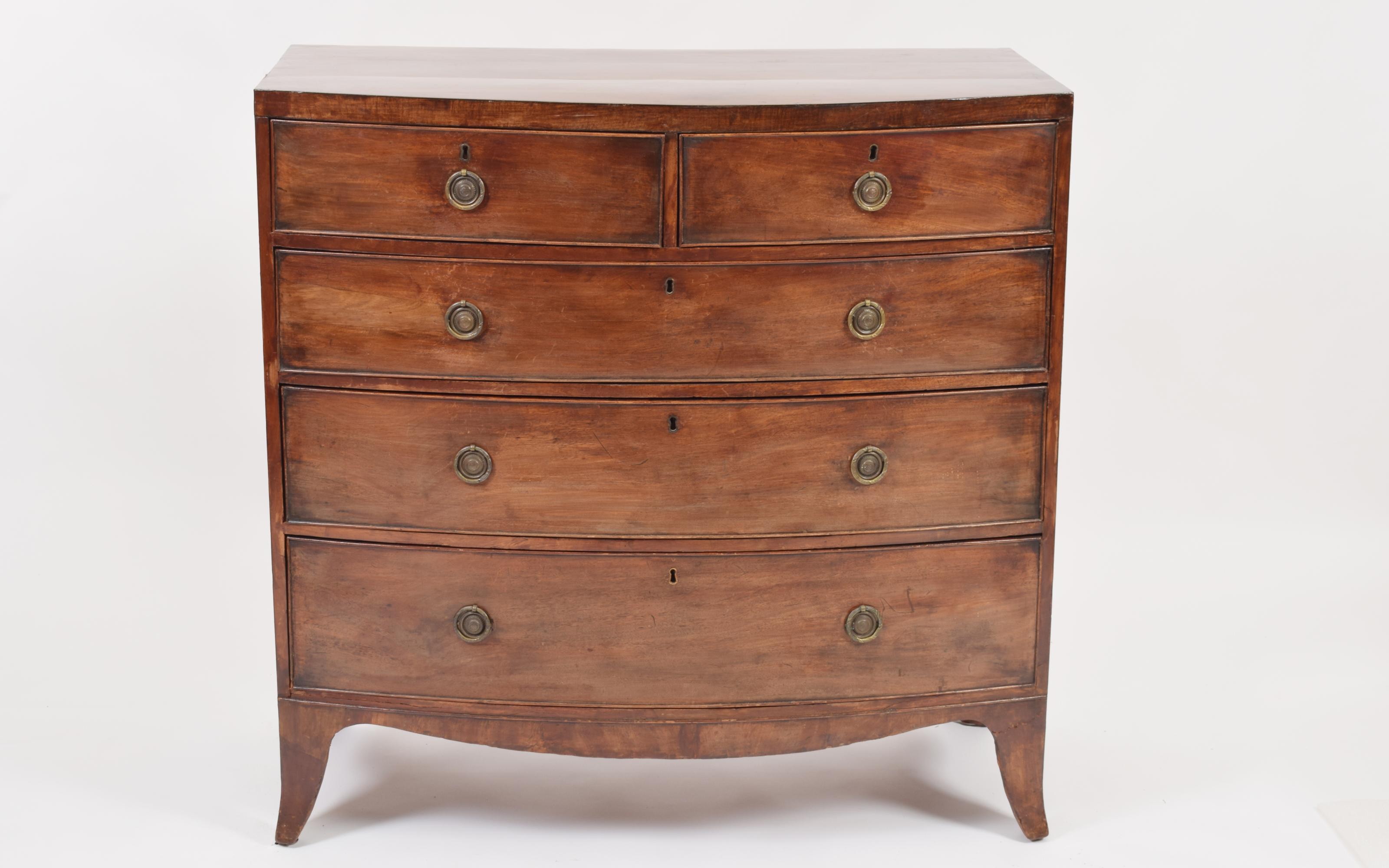 Cómoda de barriga Jorge IV (1820-1830) carvalho folheado a mogno caixa de frente curva, com duas gavetas e três gavetões, ferragens em metal amarelo relevado Inglesa sinais de uso, riscos, pequenos defeitos Dimensões (altura x comprimento x largura) - 103 x 104 x 52 cm