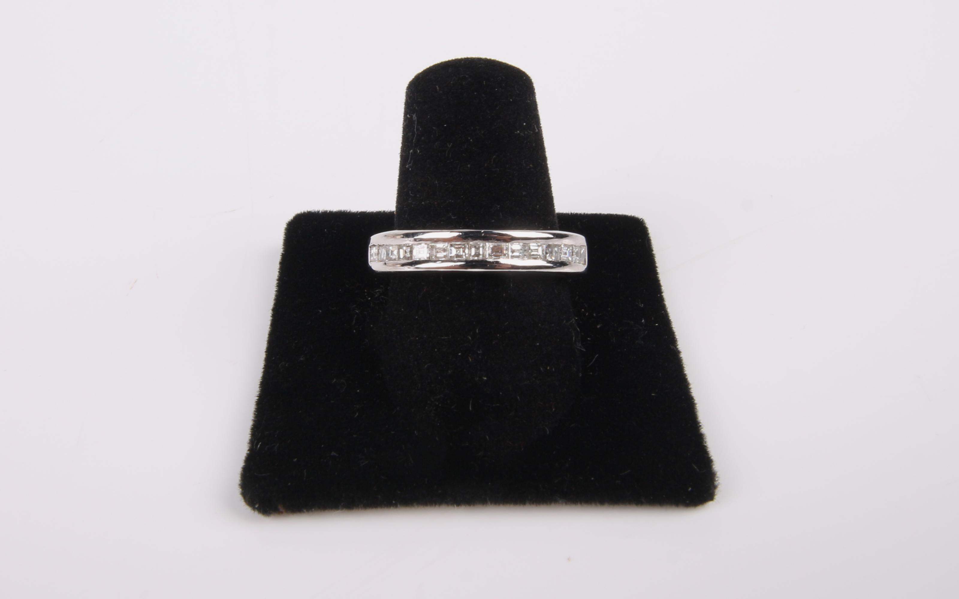 Anel ouro de 800/1000 cravejado com 15 diamante em talhe baguette com o peso aproximado de 0,30 ct. Português contraste do Porto (pós-1985) (Vidal - 4093) Dimensões (altura x comprimento x largura) - 11 (16 mm) cm; Peso - 6,7 g.