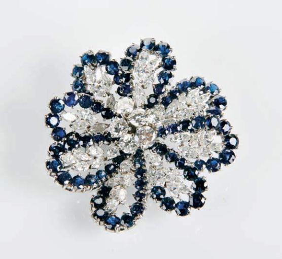 platinum set with 90 sapphires, 47 navette-cut diamonds (5,60 ct.)