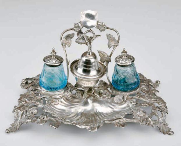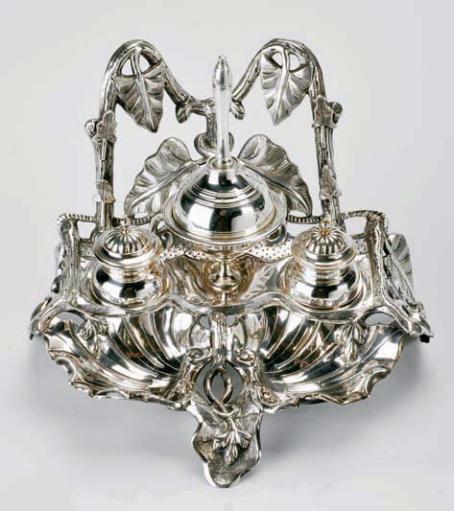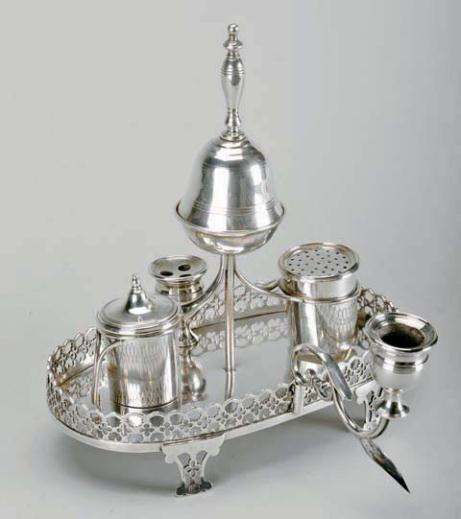 silver, comprising an ink well, a pounce pot, a pen holder and a bell,
