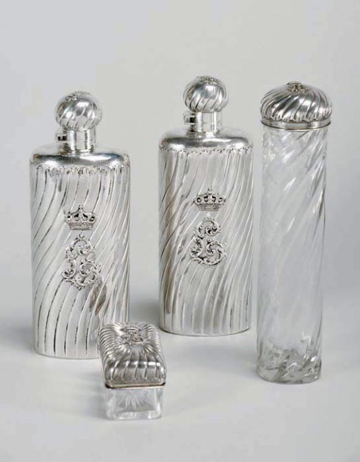 prata espiralada, monograma e coroada “L”, frascos em vidro