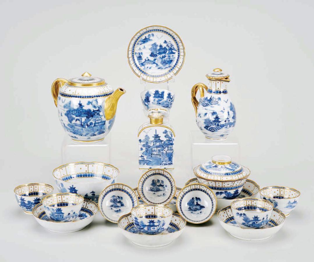 Chinese export porcelain, blue and gilt decoration “Oriental landscape”,