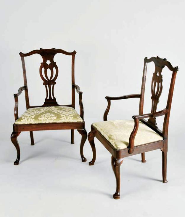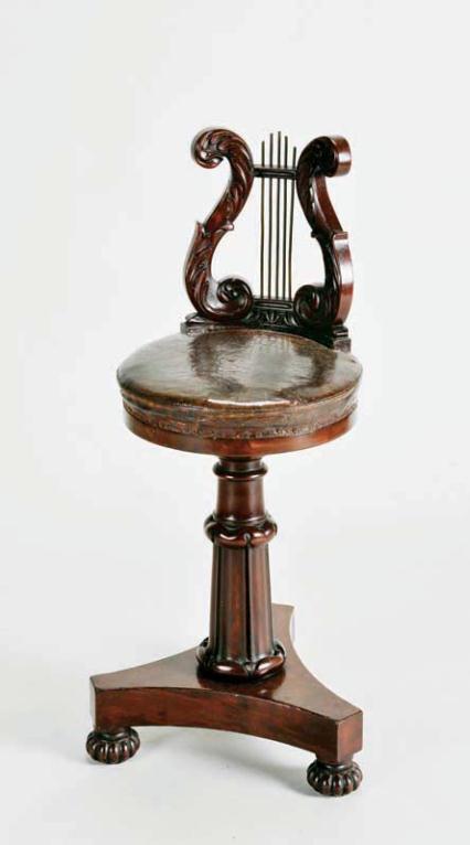 mahogany, round seat leather upholstered, “Lyre” shaped back,