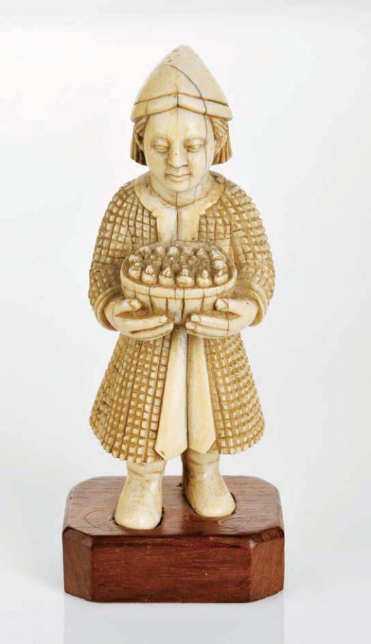 escultura em marfim, cabelos compridos e barrete cónico,