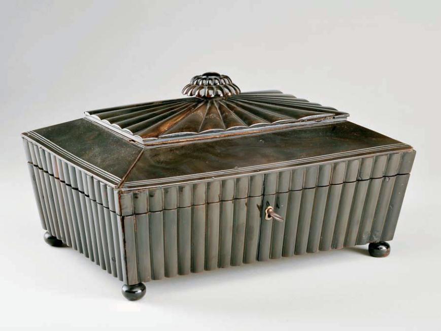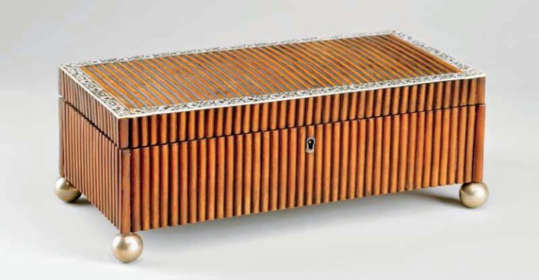 frisos em marfim gravado com fundo escurecido “Flores”, interior com frisos em ébano, pés esféricos e ferragens em prata,
