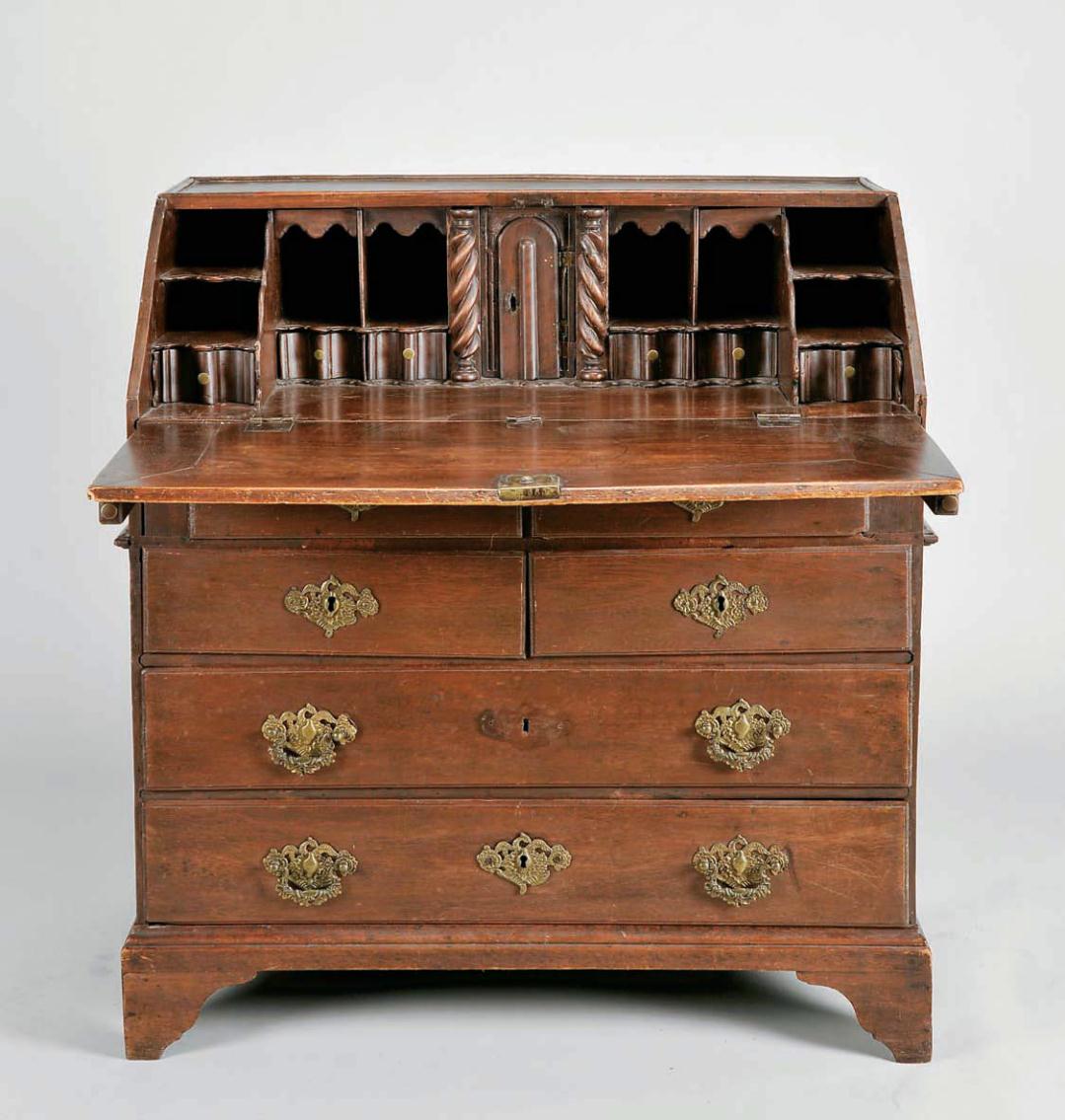 walnut, interior with drawers, pigeon holes and spiral columns,