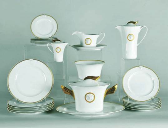 seis pratos de sopa, rasos e de sobremesa, cafeteira e leiteira,