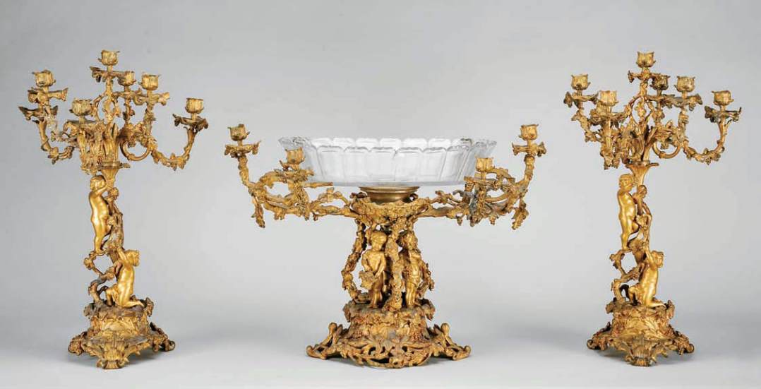 ENTRO DE MESA E PAR DE CANDELABROS DE SEIS LUMES