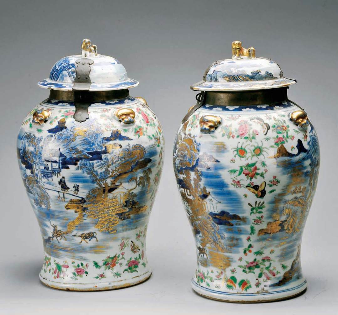 decoração policromada e dourada “Paisagem oriental com figuras”,