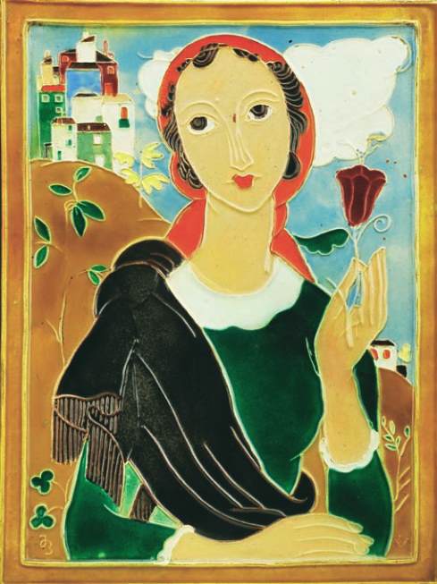 placa cerâmica relevada, decoração policromada,