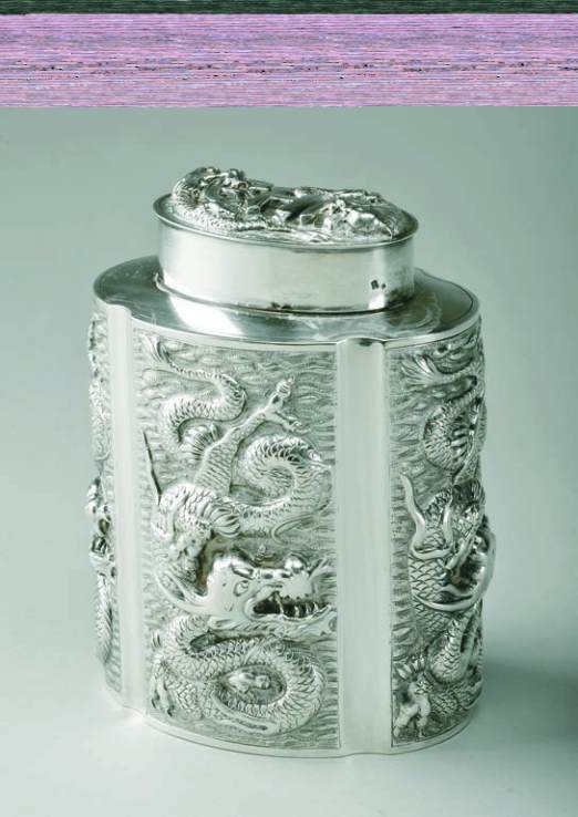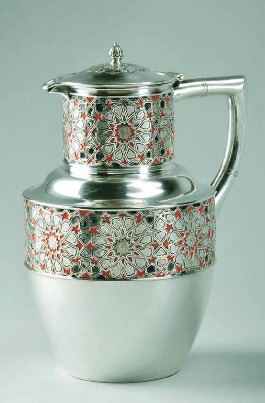 prata, decoração geométrica com esmaltes vermelhos e negros,