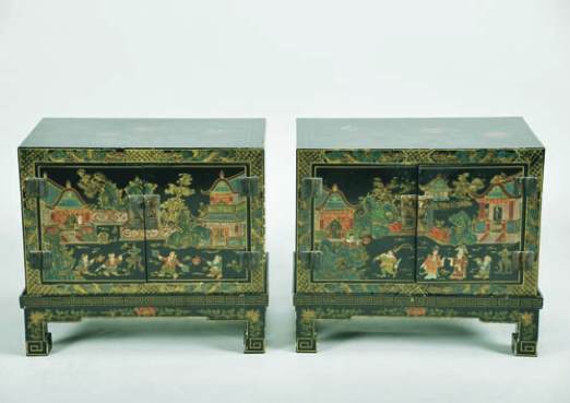 madeira lacada a negro “Pássaros e Flores” e “Figuras orientais”,