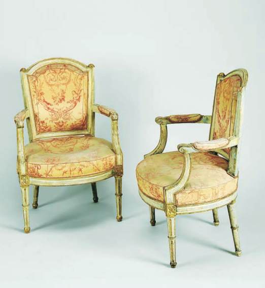 madeira lacada e dourada, forrados a “Toile de Jouy”,