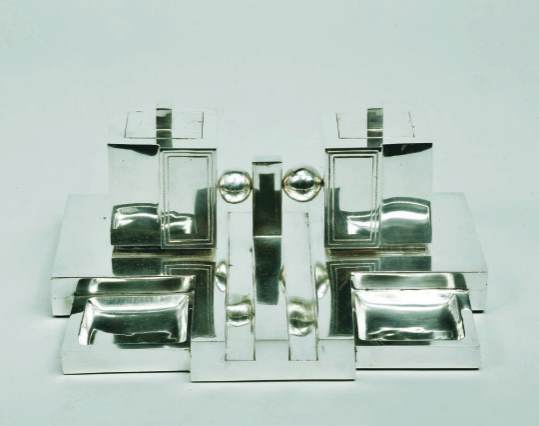 prata, composta por dois tinteiros, porta-canetas e dois recipientes,