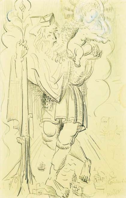 lápis e lápis de cor sobre papel, assinado e datado de 1946
