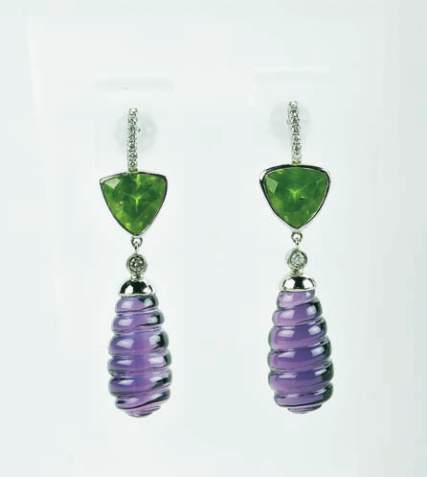 2 spiral drop sculpted amethysts and 16 brilliant cut diamonds
