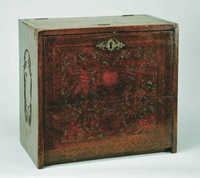cedro, decoração piro-gravada e pintada “Putti, fauce de leão, fidalgos