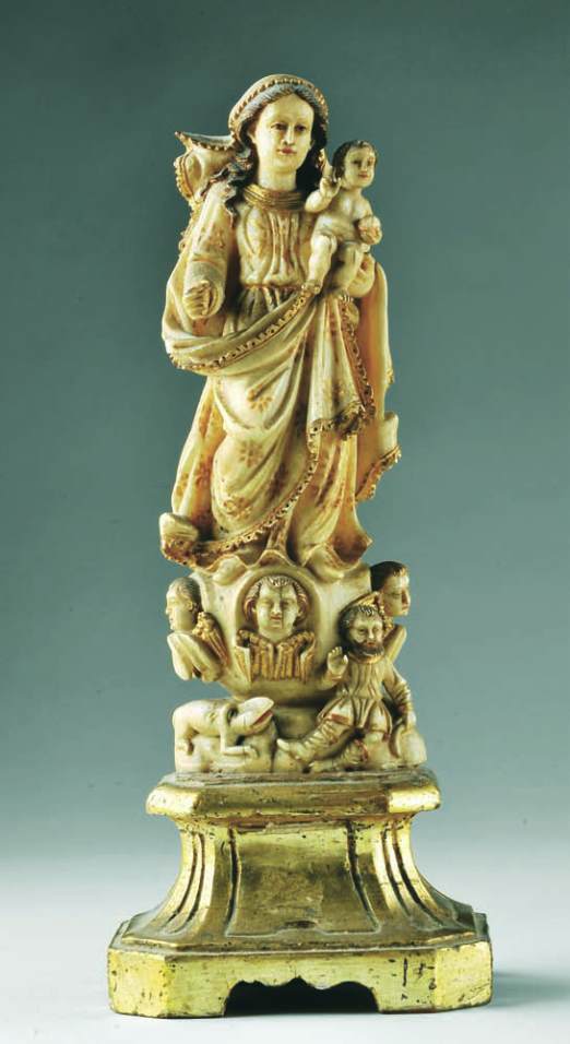 partly polychrome and gilt ivory sculpture, gilt wood base,