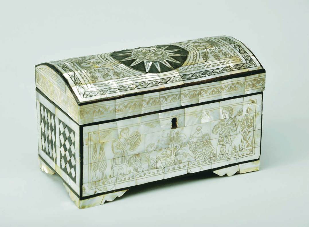 madeira revestida a placas de madrepérola gravada e massa negra,
