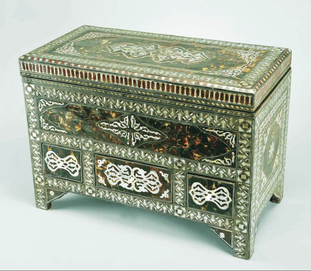 madeira revestida a marchetaria de tartaruga e madrepérola,