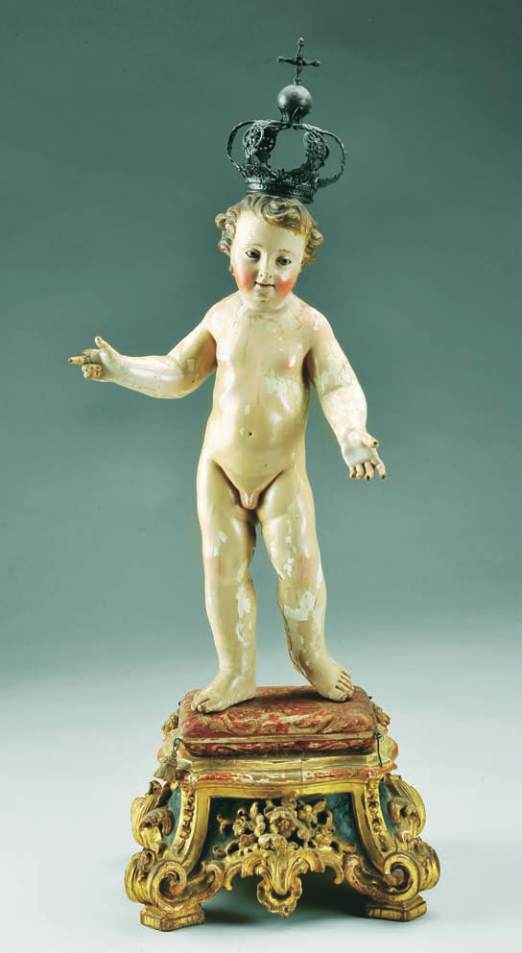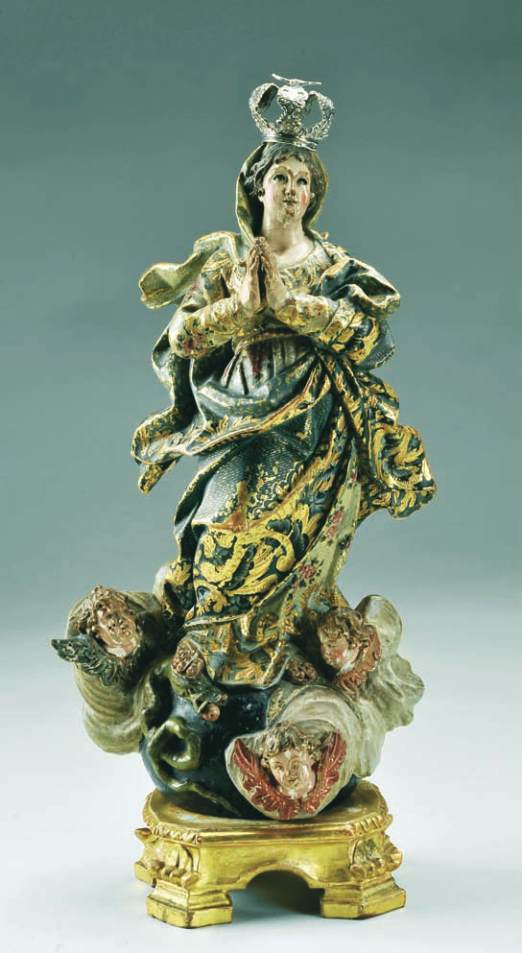 peanha marmoreada e dourada, olhos em vidro, coroa em prata,