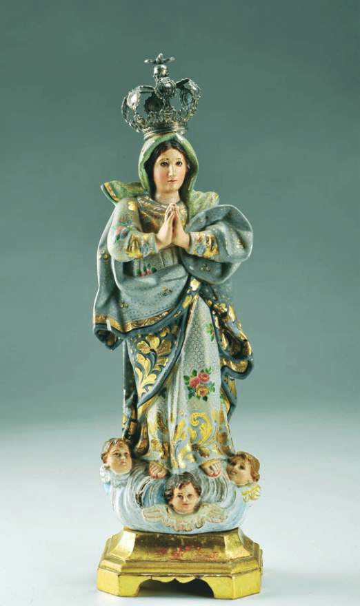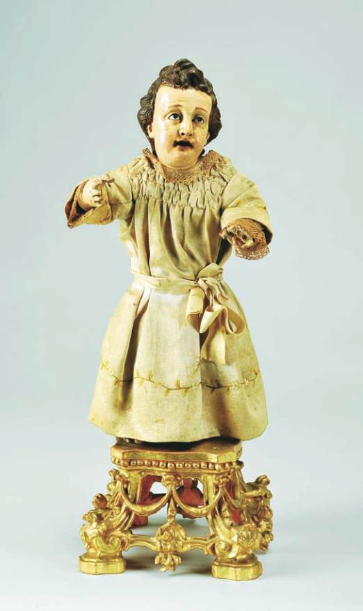 olhos em vidro, peanha em madeira entalhada, vazada e dourada,