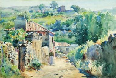 “Female figure near rural houses”,