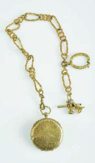 Portuguese gold chain with two seal pendants and watch key,