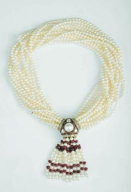 Comprising 12 rows of culture pearls (5 mm) and ruby beads,