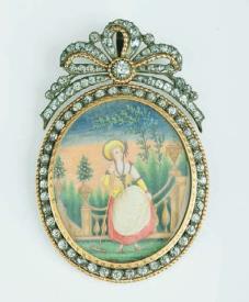 silver and gold, set with aquamarines, miniature on ivory “Peasant woman”, Portuguese,