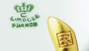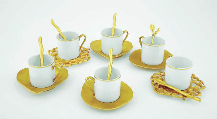 porcelana de Limoges, pires e colheres em metal dourado, pires com formas diversas,