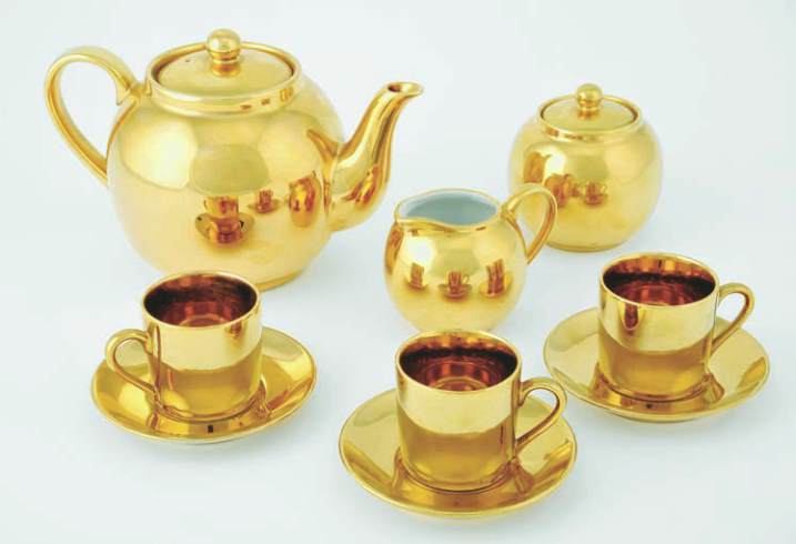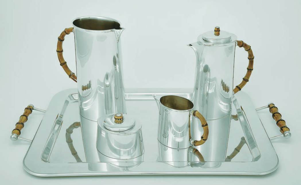metal prateado, composto por cafeteira, jarro, leiteira, açucareiro e bandeja,