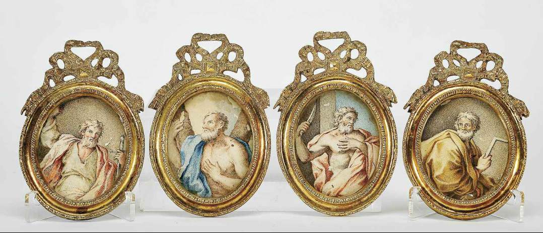 four miniatures on parchment, relief and gilt bronze frames,
