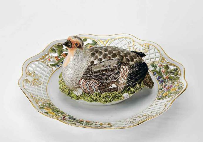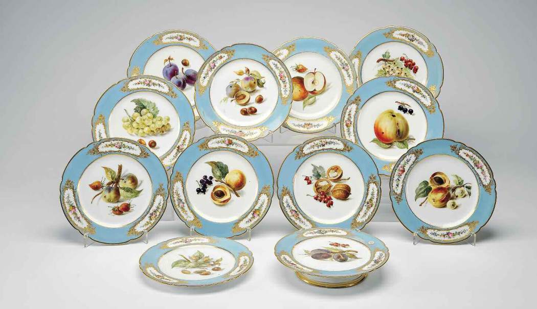 porcelana, decoração policromada “Frutos”, aba com decoração a azul e dourado