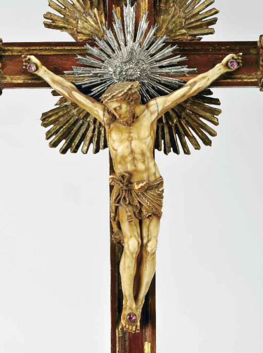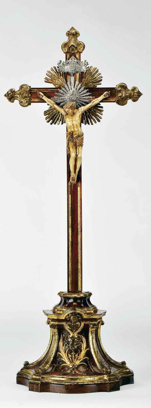 cruz em madeira entalhada e dourada com aplicações em prata,