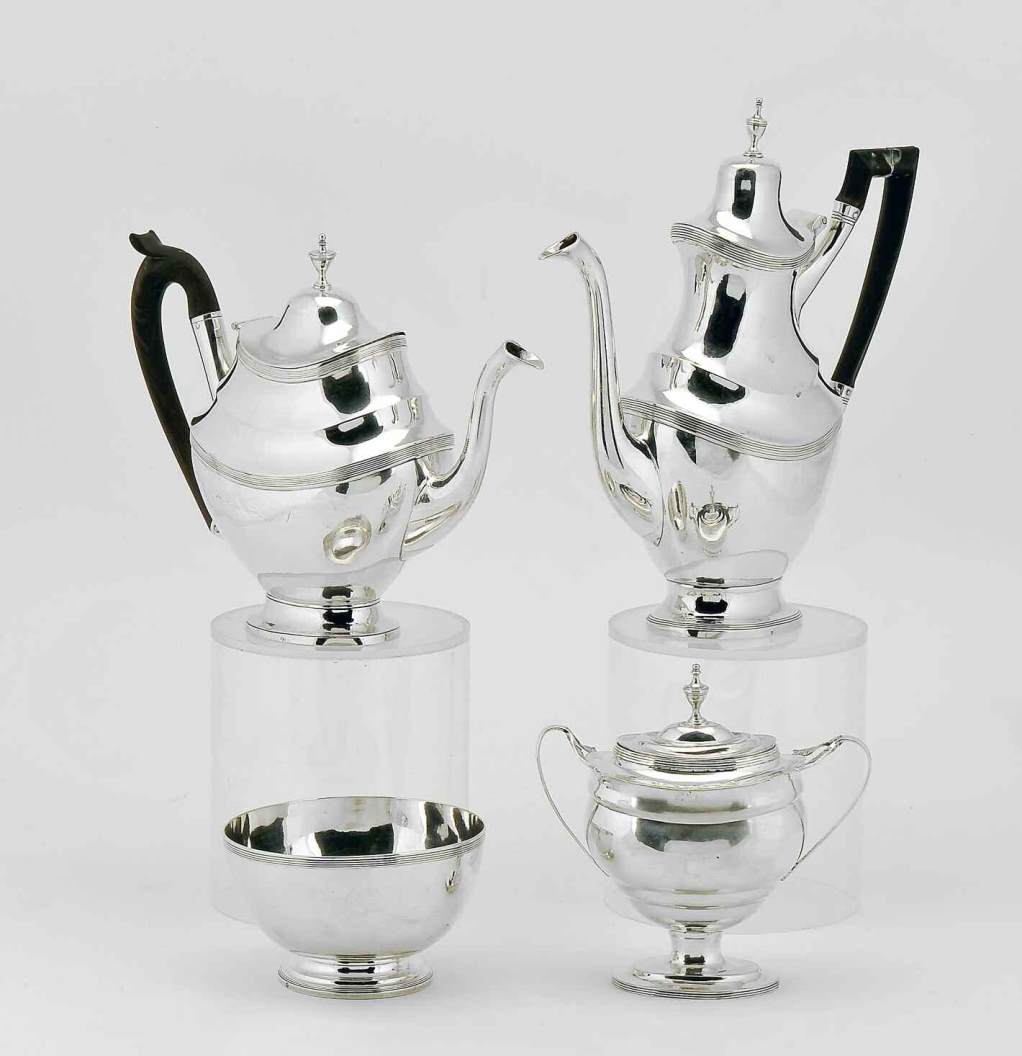 a coffee pot, a sugar bowl and waste bowl, wooden handles,