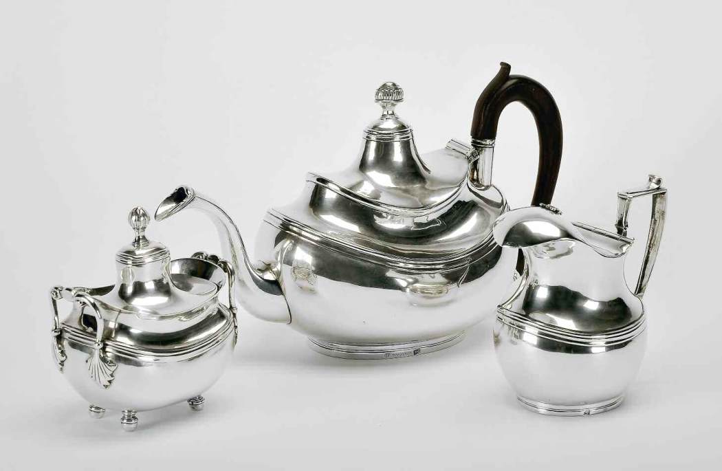 D. Maria I (1777-1816), prata, composto por bule, leiteira e açucareiro, marca de ensaiador