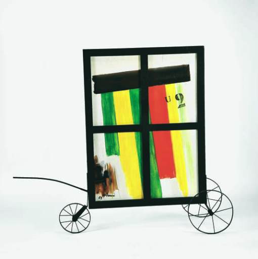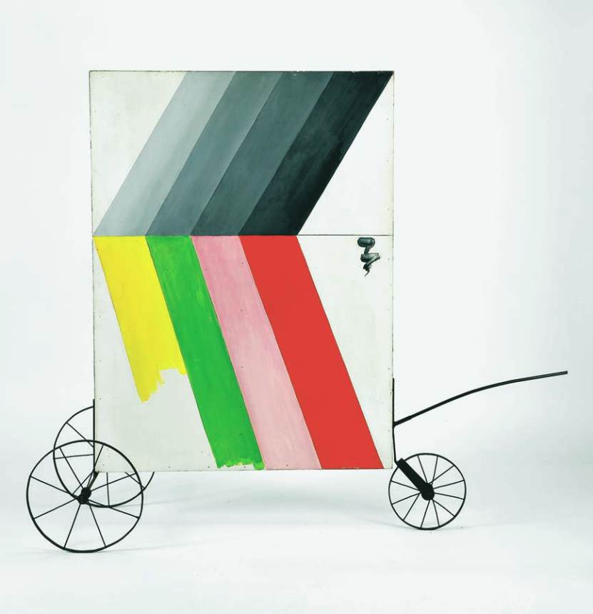 óleo sobre as duas faces de contraplacado assente em triciclo,