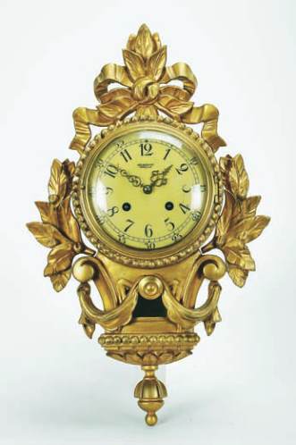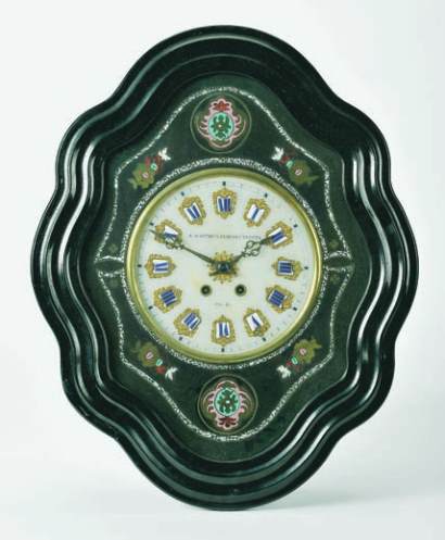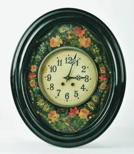 de latão e esmalte, autonomia de oito dias, toca horas e meias horas,