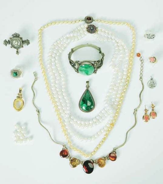 pulseira rígida, 3 anéis, par de brincos, alfinete e 3 pendentes,