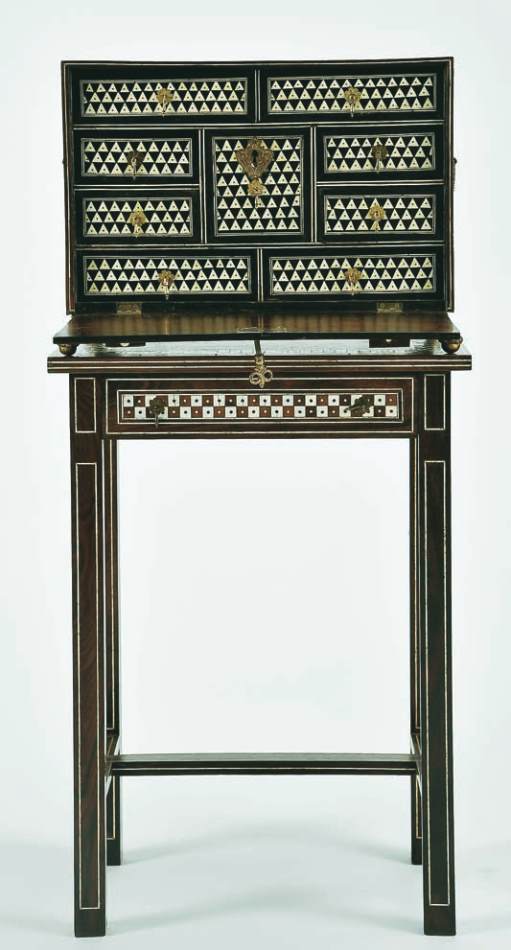 interior com oito gavetas simulando nove, com frentes marchetadas