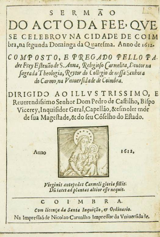 Primeira edição do primeiro sermão de um auto-de-fé publicado em Portugal e o primeiro realizado em Coimbra. Fr. Estêvão de Santa Ana,