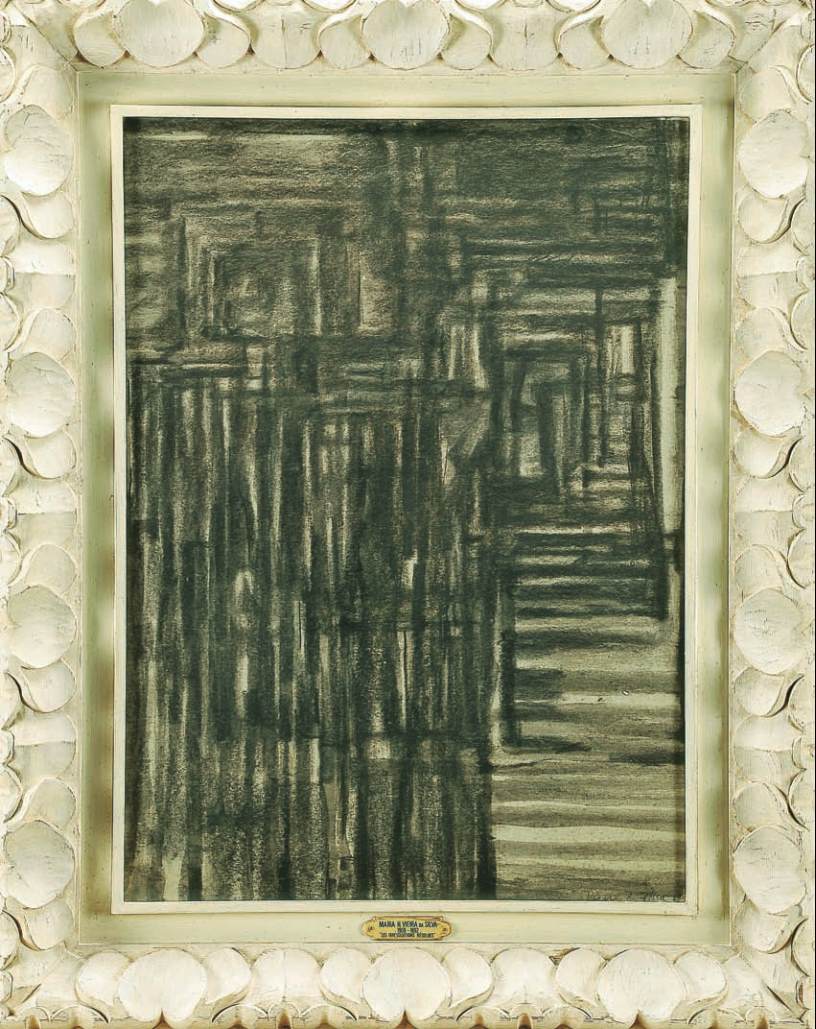 carvão sobre lã de vidro colada em tela, assinado e datado de 1969