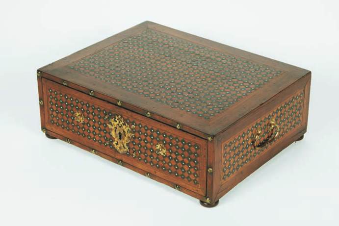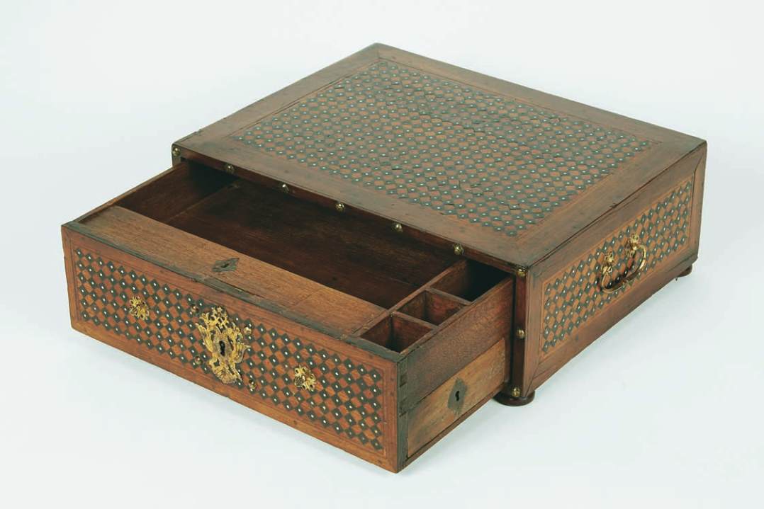 studs, interior with container with lid and dividers for inkwell and pounce pot,