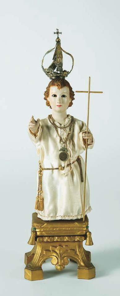 carving, glass eyes, fabric robes, silver crown, gold ornaments,